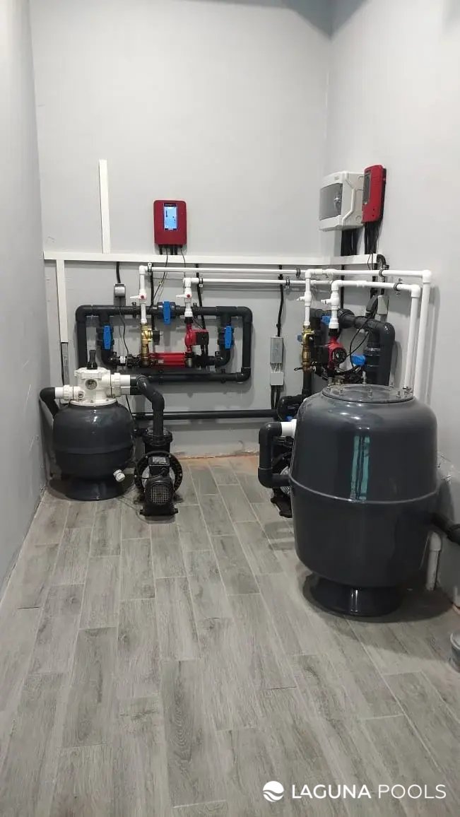 Техническое помещение оборудовано насосно-фильтрационными системами с элементами управления на светлых стенах.